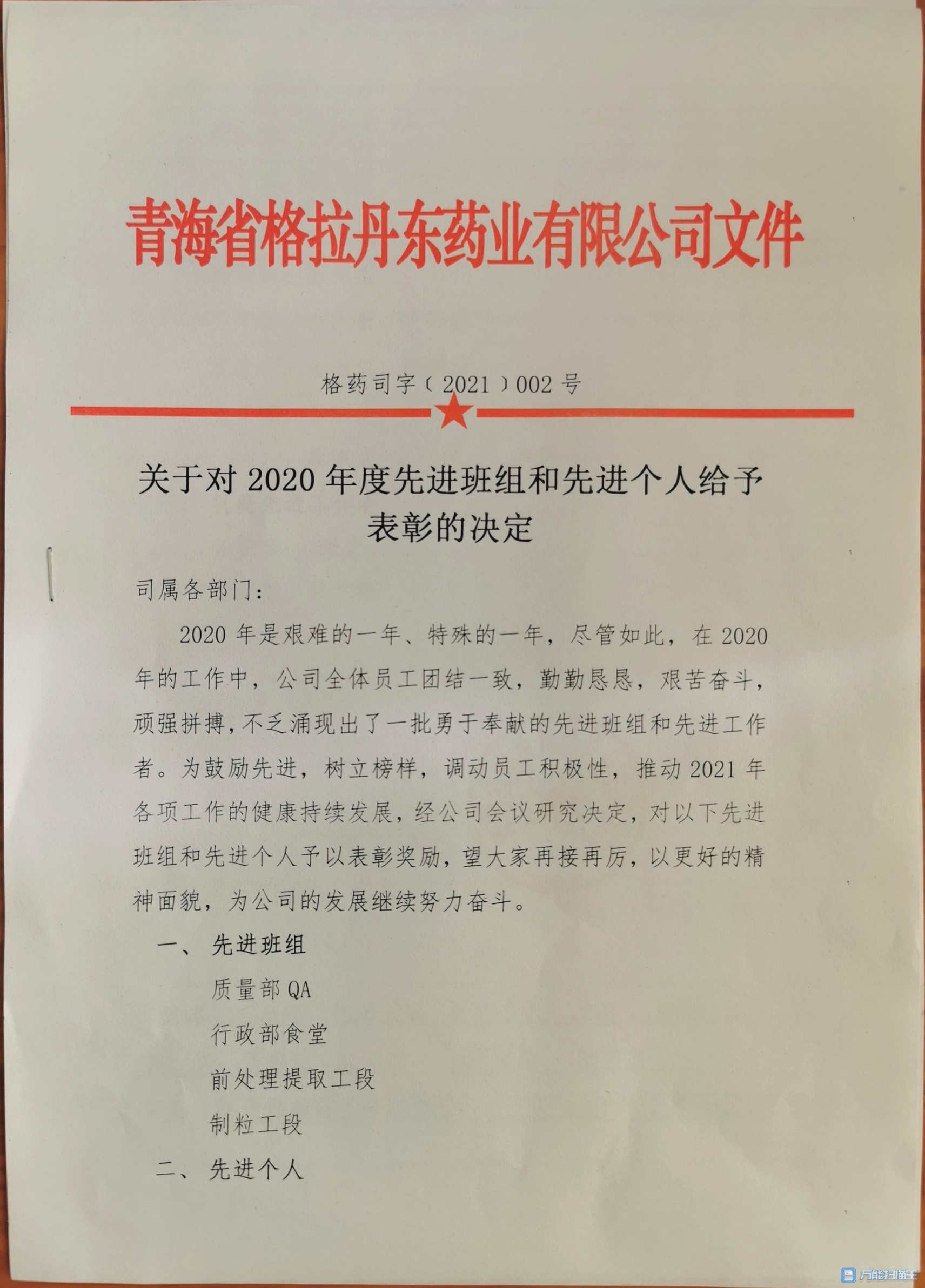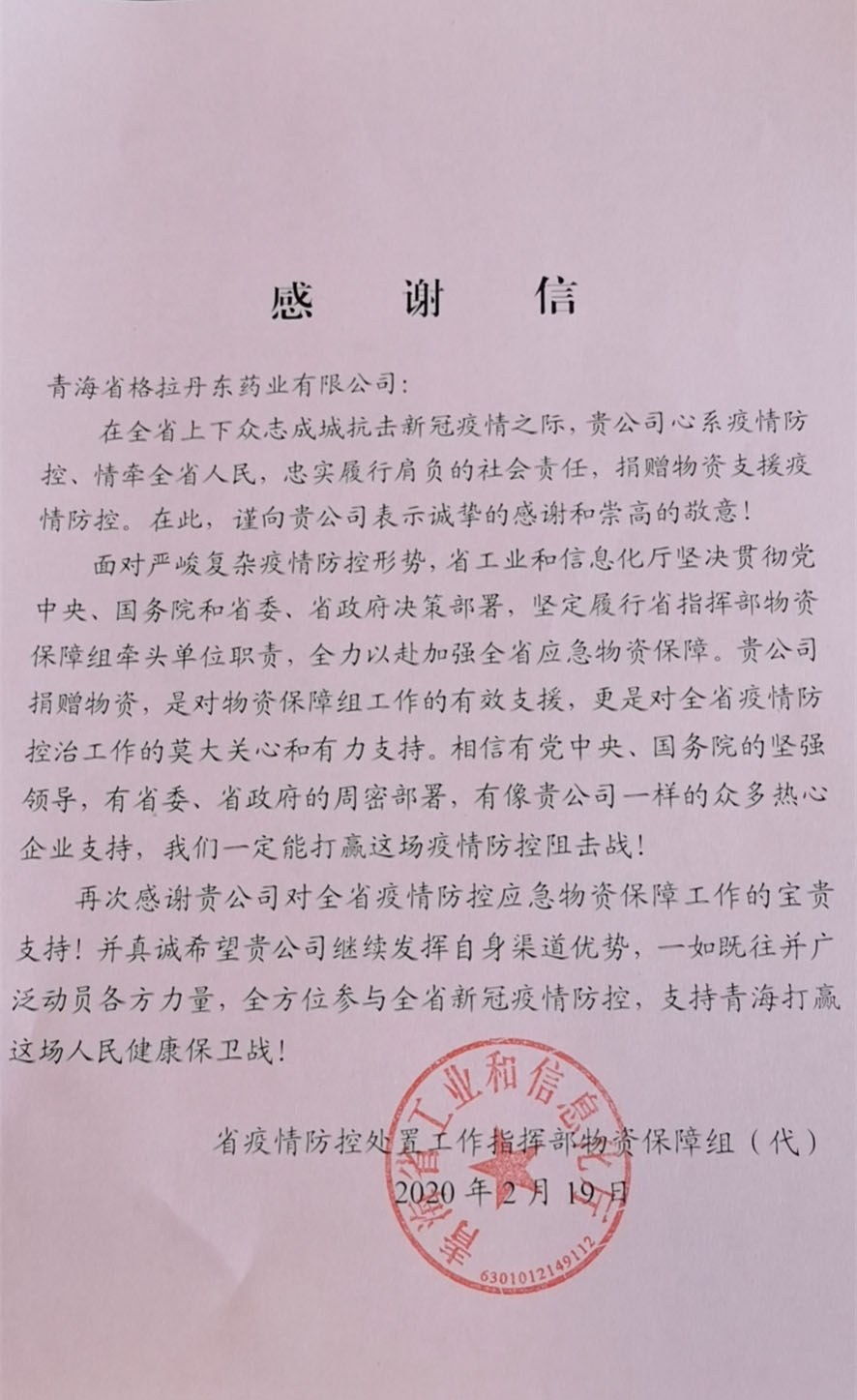 青海省市場監(jiān)督管理局 青海省藥品監(jiān)督管理局 致青海省格拉丹東藥業(yè)有限公司的感謝信