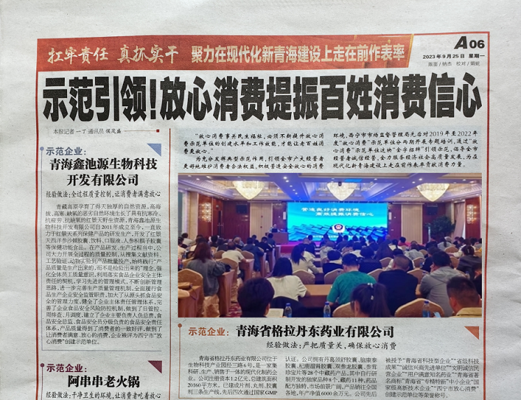 青海省格拉丹東藥業(yè)有限公司作為“西寧市‘放心消費’創(chuàng)建活動示范單位”、“青海省‘大美青海放心消費’創(chuàng)建活動示范單位”,再次榮獲《西寧晚報》放心消費示范企業(yè)。公司將以本此次活動為契機,嚴(yán)把藥品質(zhì)量、落實主體責(zé)任、確保放心消費,并繼續(xù)圍繞“安全、質(zhì)量、價格、服務(wù)、維權(quán)”五個放心,進一步完善藥品生產(chǎn)質(zhì)量管理體系,提升藥品質(zhì)量和服務(wù)品質(zhì),在行業(yè)內(nèi)發(fā)揮示范帶頭作用,為打造安全放心消費環(huán)境作出新的更大貢獻。